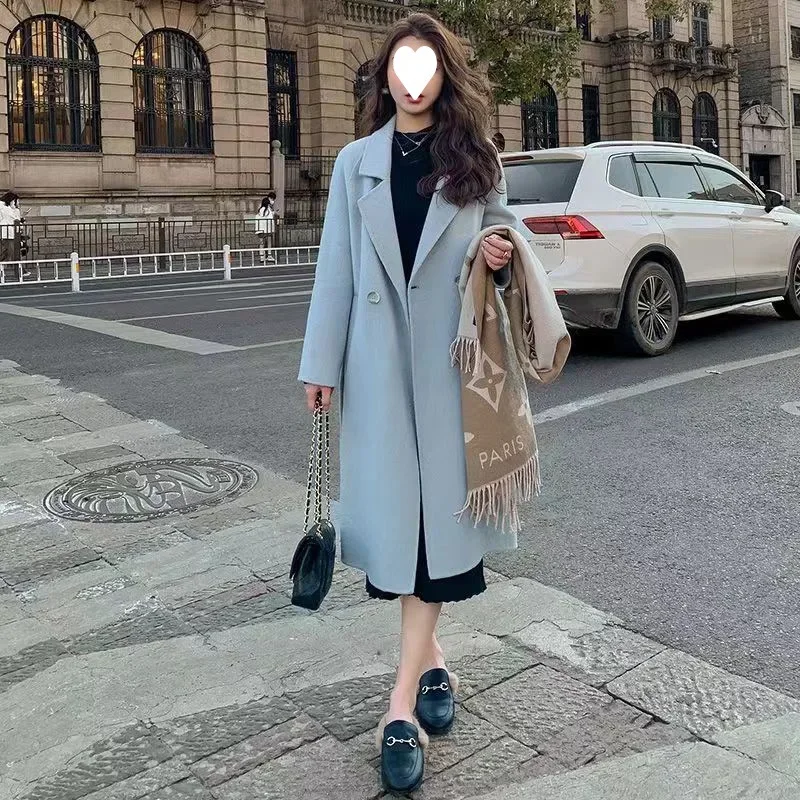 Pink Double-Sided Woolen Coat Women's Loose Mid-Length Belted Outerwear Autumn Winter New Style Korean Version Polyester Fiber